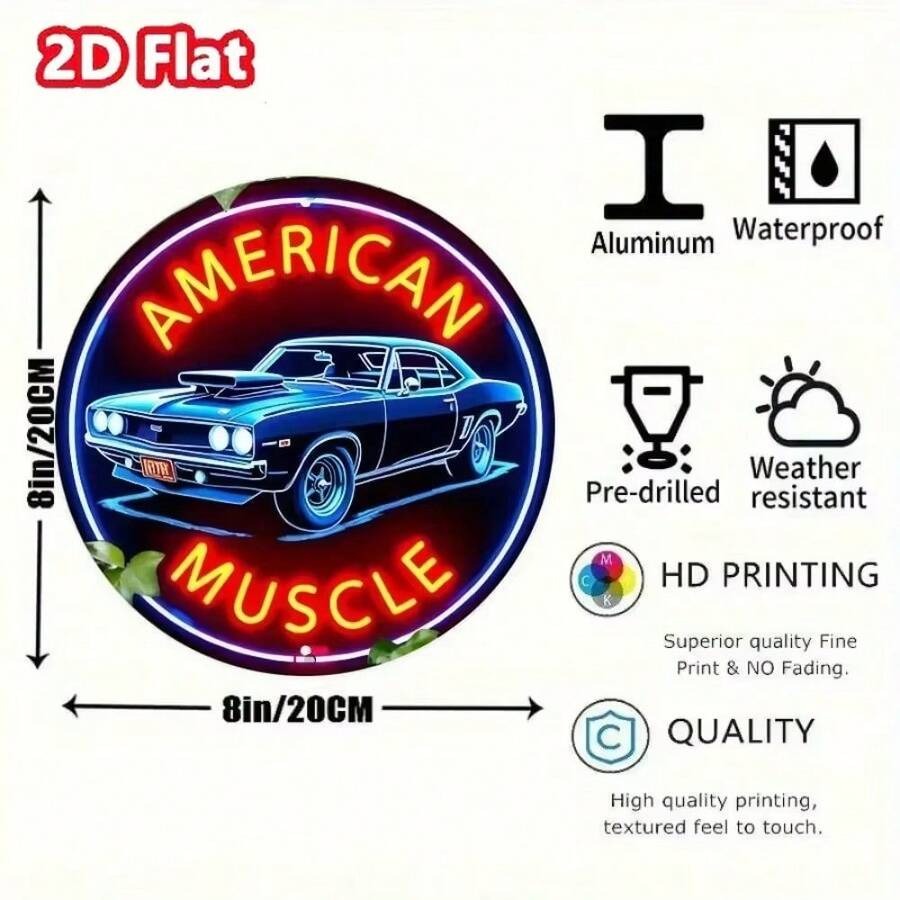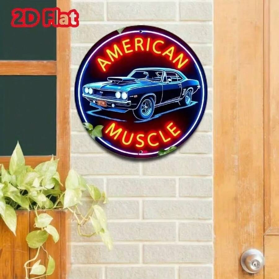 American Muscle Car Neon Sign – 19.81×19.81 Cm Round Aluminum Metal Wall Art, Rustproof Waterproof Retro Garage Decor With Vibrant Red & Blue Classic Muscle Car Design, Neon-Lit Lettering For Bars, For Man Cave, Backyard, Car Enthusiast Gift, Automotive Wall Art, Room Decor, Metal Wall Art, Metal Wall Art Decor, Vintage Metal Sign, Round Metal Sign, Wall Decor, Tin