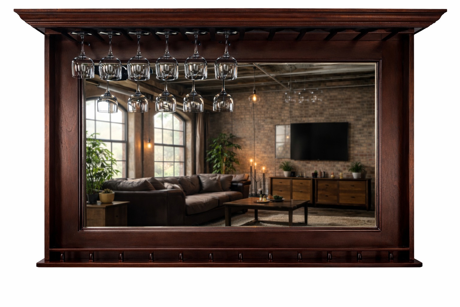 Add style behind the bar with the english tudor finish bar mirror with a glassware rack across its top.