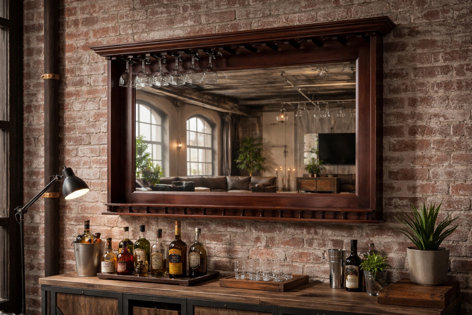 Stemware holders above mirror; bottle storage in front.