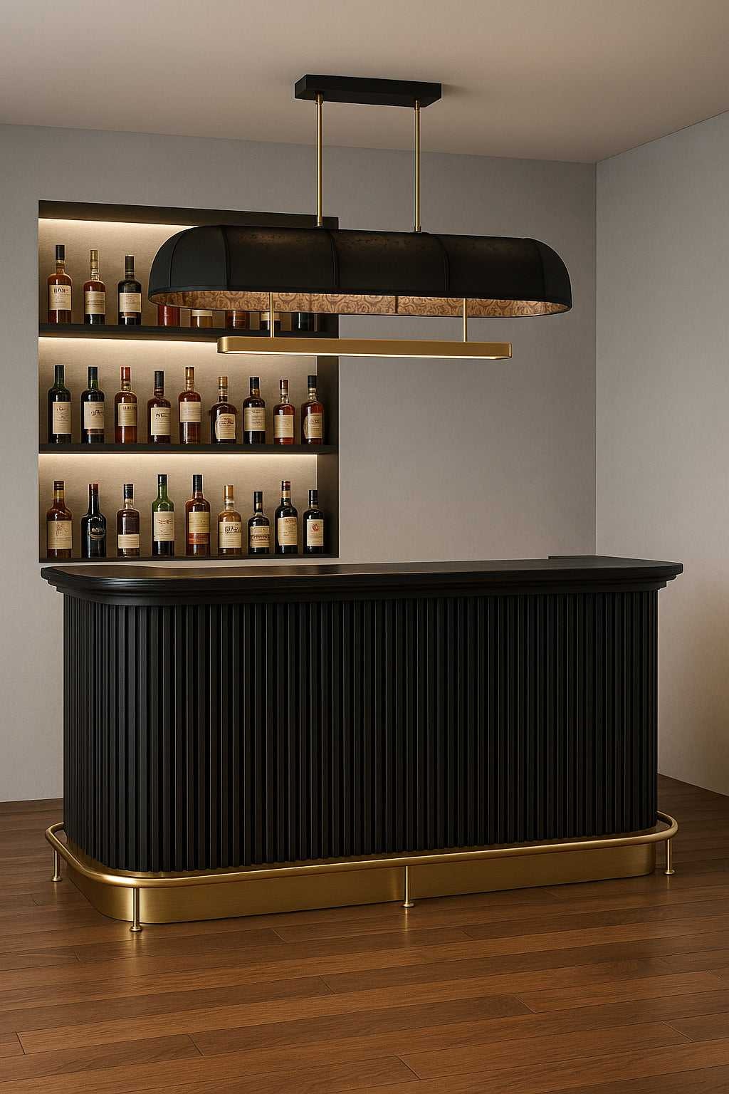 The fixture features a satin black textured canopy with a Parisian tile inspired pattern adorning the interior. The downrods and light bar are elegantly finished in satin brass, adding a refined contrast and a touch of timeless sophistication. At home over a Billiards table, Poker Table or Cocktail Bar.