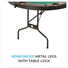 This poker table is a marvel of engineering ingenuity. Starting at the base, the Fat Cat Texas Hold-Em poker table is constructed from durable and long lasting metal. Strong enough to last, and light enough to carry anywhere. Moving up from there, the table lock suspension system ensures that your table will wobble no more once fully set up, a must when enjoying long nights of gaming greatness. The surface of the table is the most notable piece of this classic design. The table top is covered in a casino grade green cloth, for that classic look and feel. Framing this attractive surface is a cushioned rail with built in drink holders, to reduce the mess of spilling on your brand new table. You’ll be sure to bring new authenticity to your poker nights when you bring the Fat Cat Texas Hold‘Em Table!