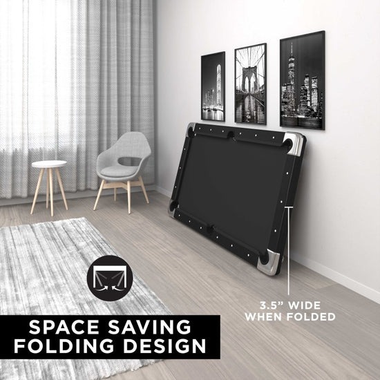 The Fat Cat Trueshot Foldable Billiard table is designed with two concepts in mind: convenience and fun. The folding leg design allows for incredibly easy set up. Simply unfold the legs, insert four screws to lock them in place, and you’re ready to play. There are also built-in leg levelers so you can set it up anywhere. This 6’ folding billiard table will fit in most spaces and the legs fold up easily so you can reclaim your room for get-togethers. The base of the Trueshot’s rails are thicker, giving your table added support. The K-818 rubber bumpers ensure you get consistent bounces on every shot. The Trueshot pool table comes with everything you need to start playing: two 57” billiard cues, a triangle, a set of 2.25” billiard balls, and a table brush.
