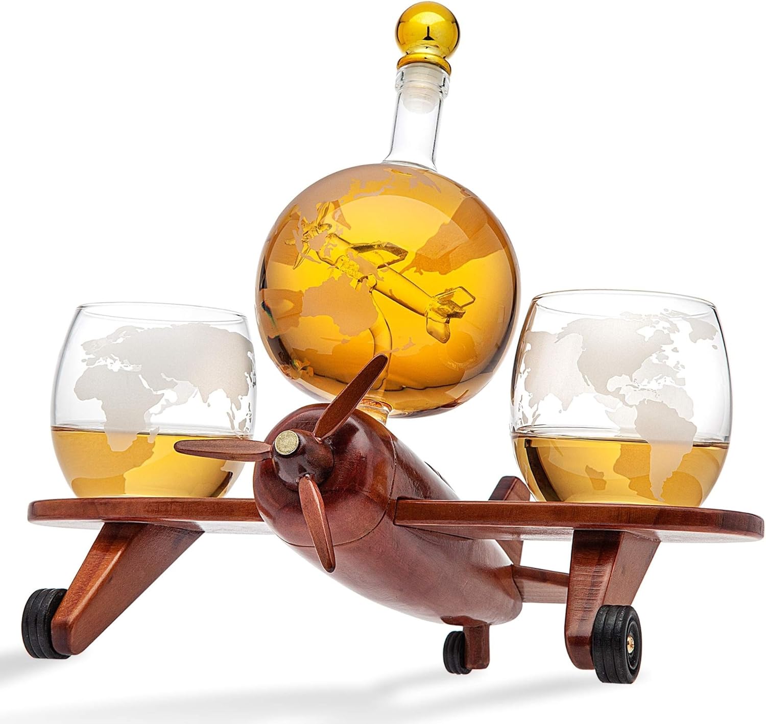 - Patented set includes whisky decanter with 2 matching globe design old fashioned whiskey glasses fitted onto a mahogany stained wooden airplane. Gold stopper adds a touch of class while keeping your spirits sealed.