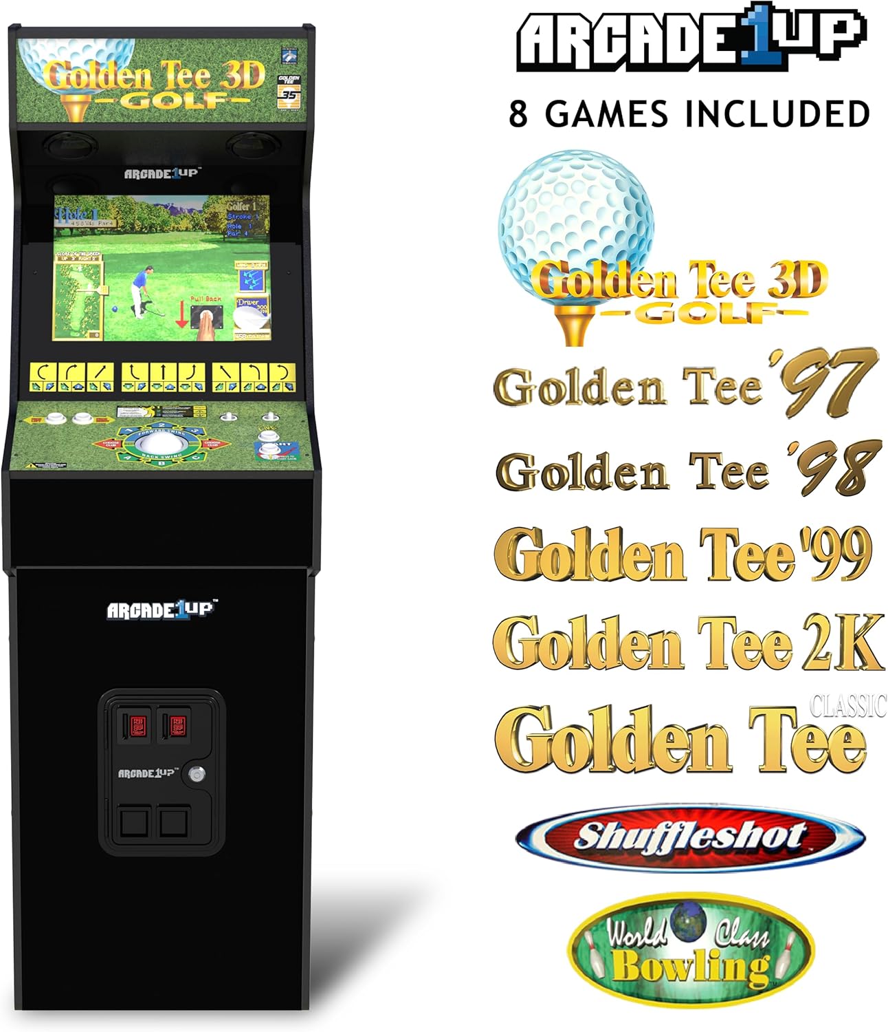 - 8 Arcade Games: Golden Tee 3D (95) | Golden Tee ‘97 | Golden Tee ‘98 | Golden Tee ‘99 | Golden Tee 2K | Golden Tee Classic | Shuffle Shot | World Class Bowling