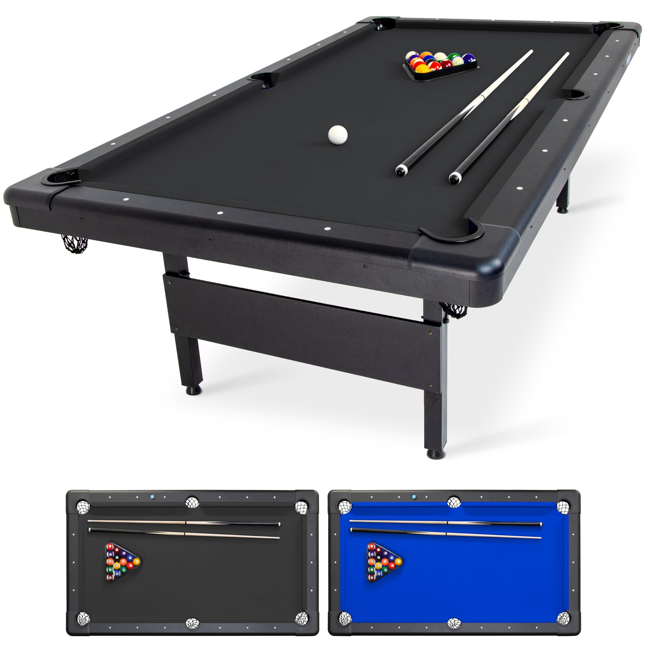 - 8 FT BILLIARDS TABLE: Heavy-duty table measures 8 ft x 4.3 ft x 2.6 ft; Full set includes 15 regulation balls and cue ball, ball rack, 2 57 inch cue sticks, 2 chalk and felt brush