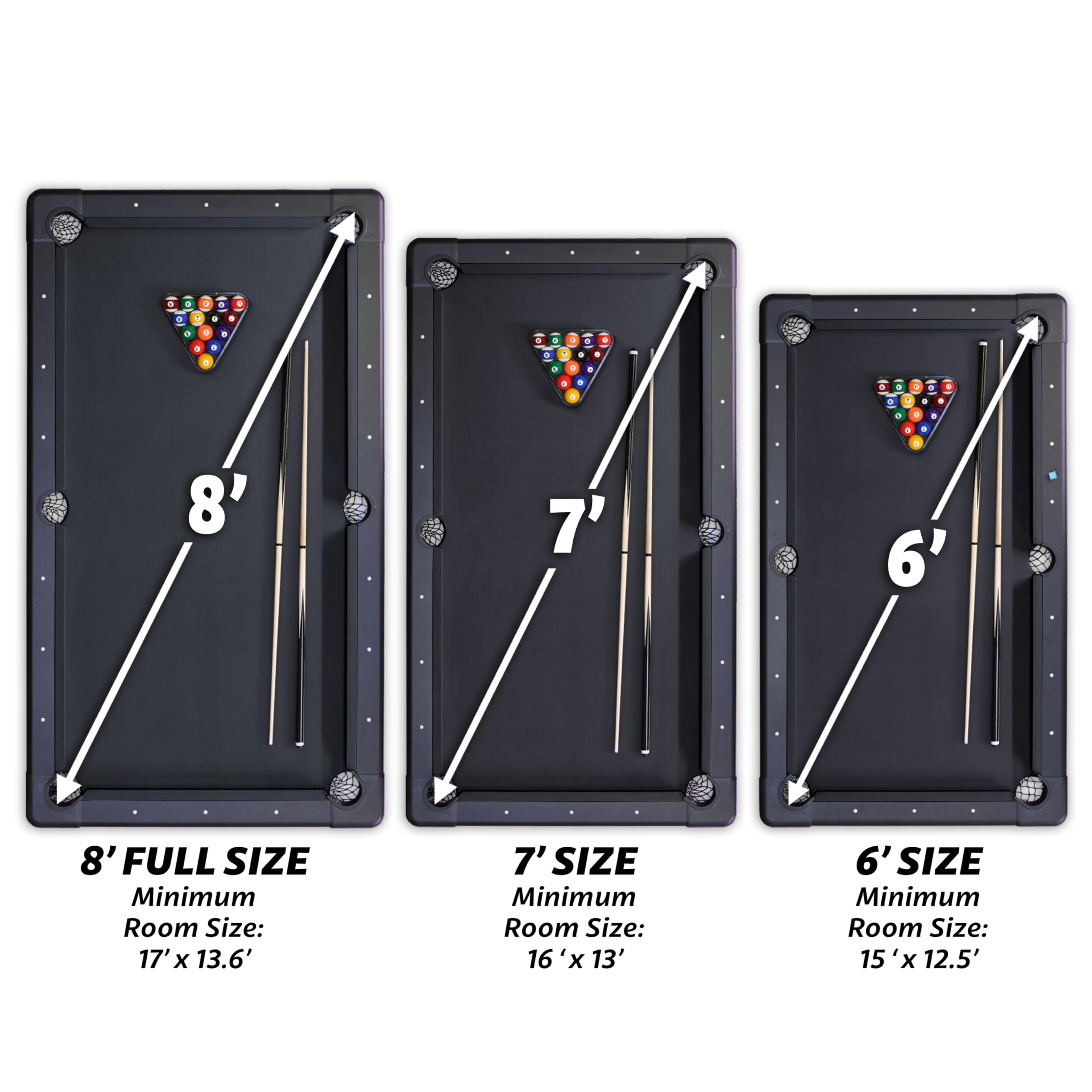 - RECOMMENDED ROOM SIZE: 13.6 ft x 17 ft minimum room size is recommended; Players can also use shorter cues (not included) for slightly smaller rooms