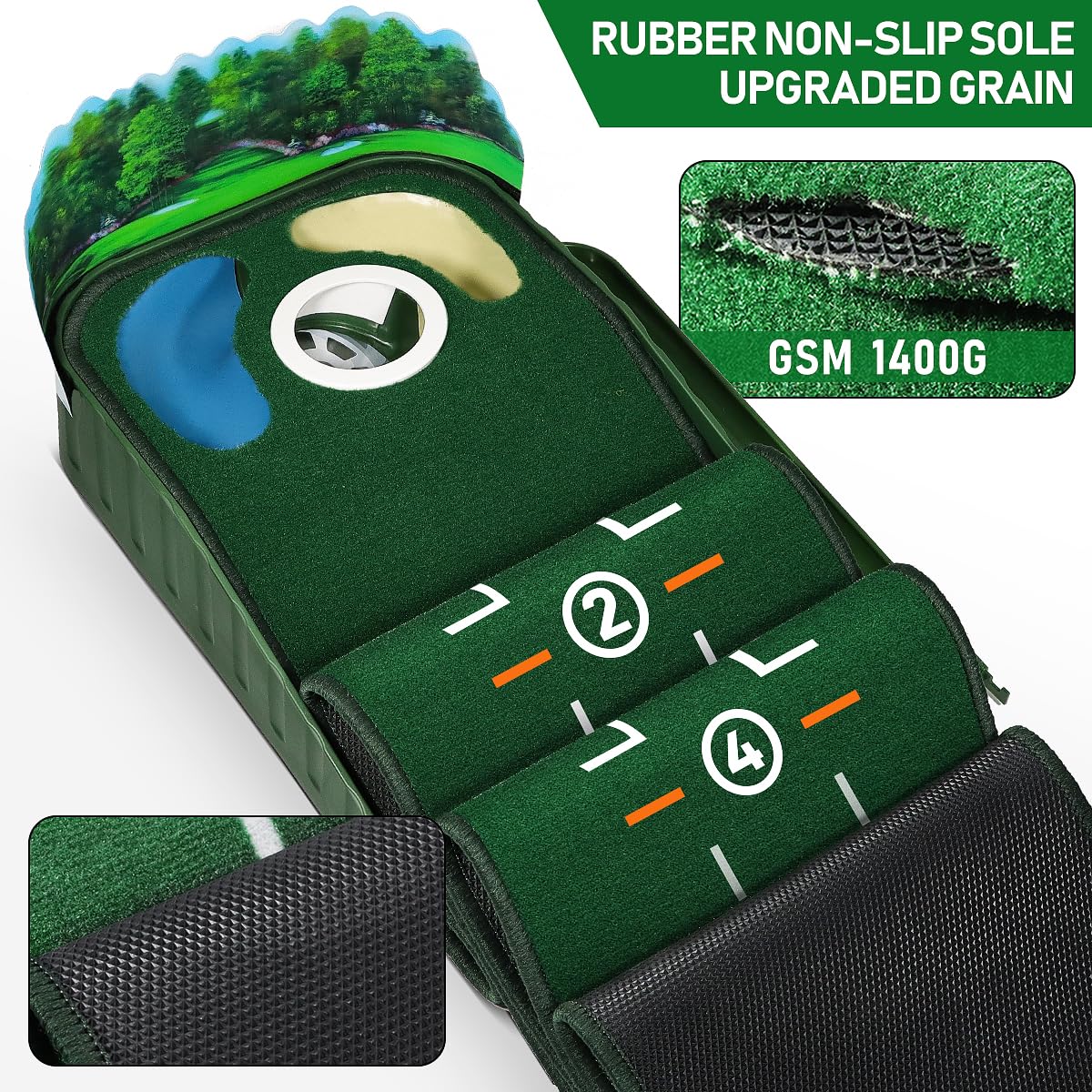 - Putting Green Simulator:Designed according to the advice of professional golfers, simulating a real golf course,Golf practice mats with bunker, and water hazard,Increase the difficulty of practice to improve your putting action and putting technique