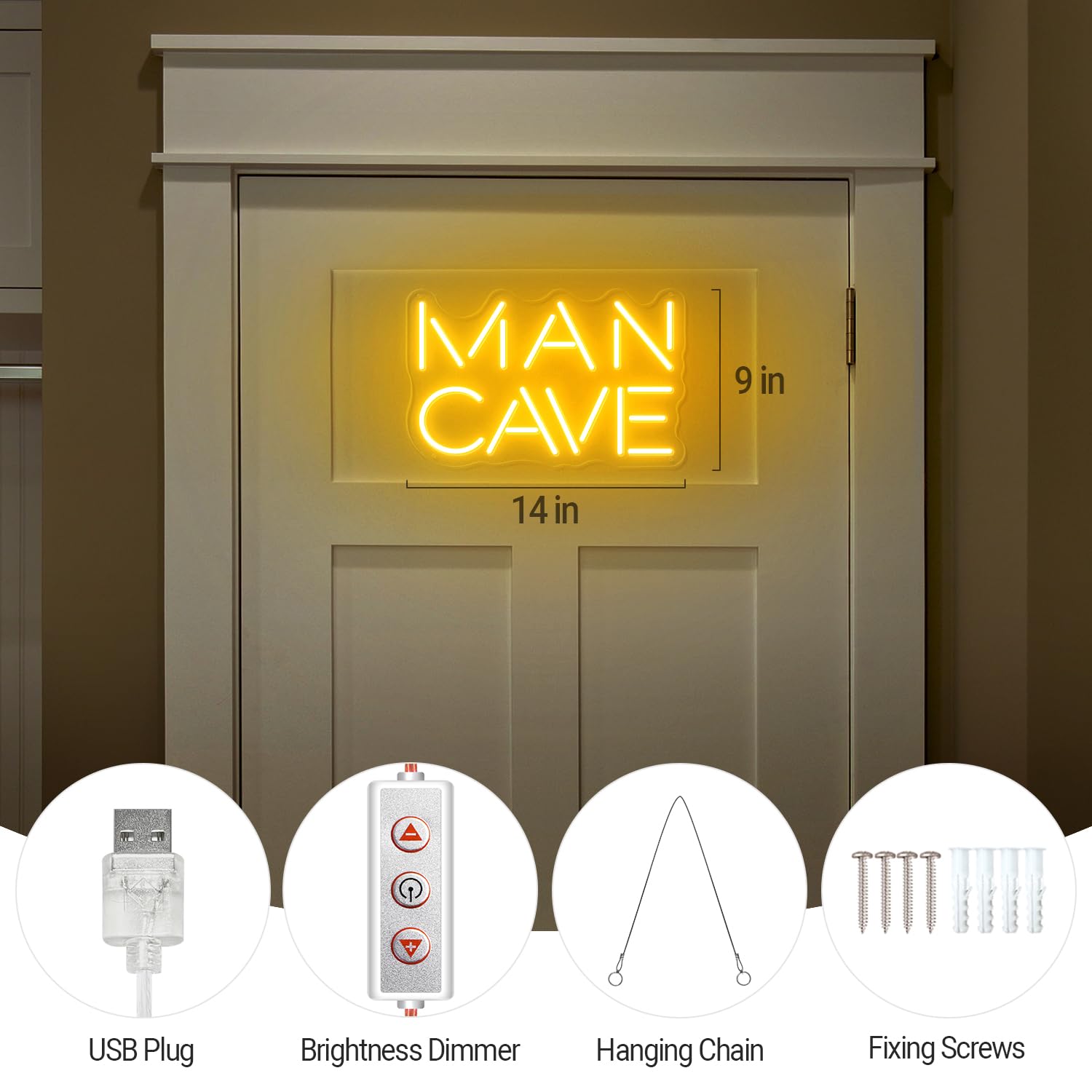 - Easy Installation: The unique man cave neon sign is come with some fixing screws and a hanging chain for you, so that you needn’t to buy again. The free USB dimmer will give you a better control of your man cave neon sign, and you can adjust the brightness, just like adjusting the brightness of your phone, which is super easy and convenience.