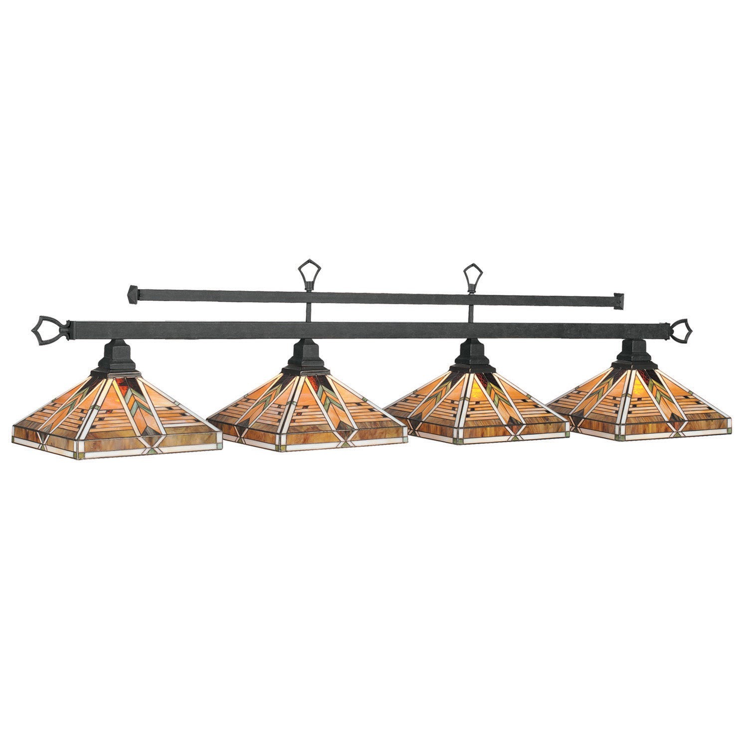 Subtle tribal details bring lively energy to the stained glass shades featured on this four-light billiard pendant, which boasts understated coloration and an matte black finish bar.