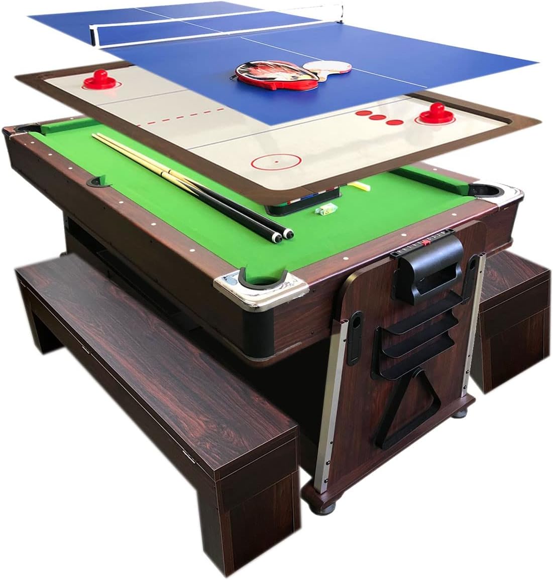 • COMPLETE SET OF ACCESSORIES – Includes cues, balls, brush, chalks, triangles, air hockey paddles and discs, table tennis rackets, net, and tops — everything you need to start playing right away.