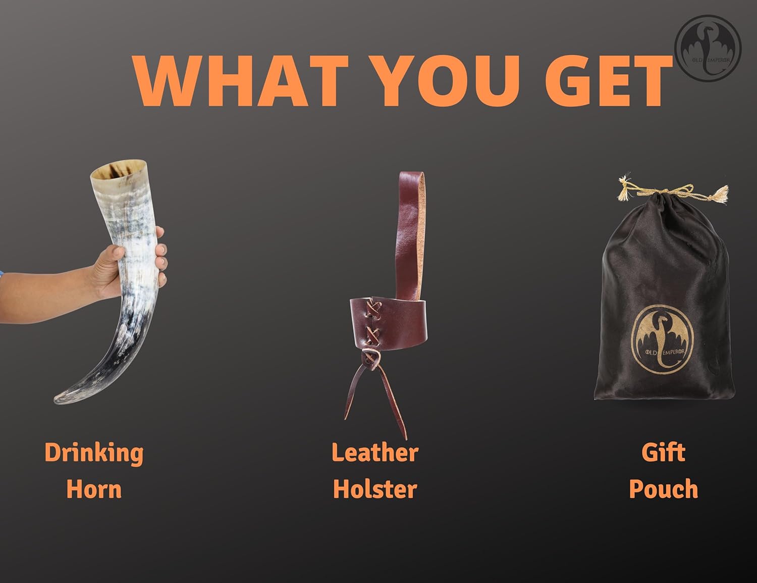 OLDEMPEROR Viking Drinking Horn – 12 Inch with Leather Holster | Handmade Beer Cup | Food Grade | Genuine Ox Horn | Natural Shine Finish | LARP | Viking Gift for Men & Women