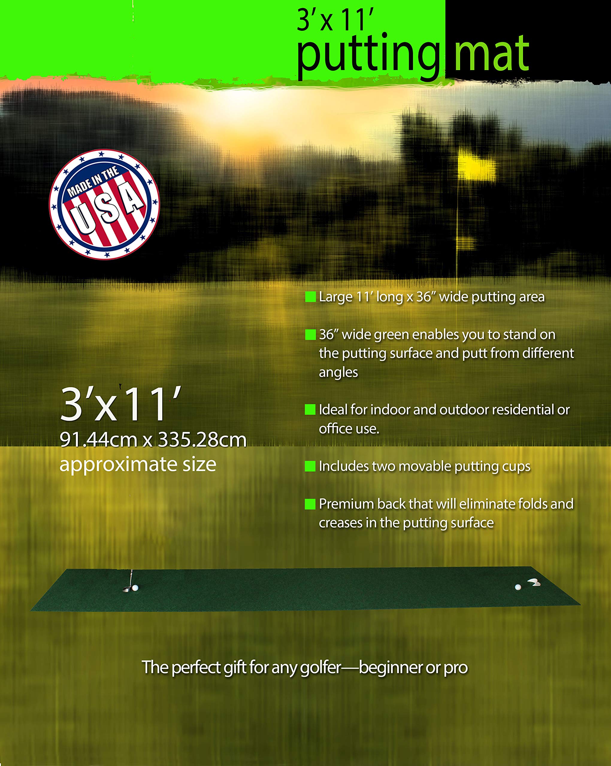 Details: Large 11′ Long X 36″ Wide Putting Area. The 36″ Wide Green Enables You To Stand On The Putting Surface And Putt From Different Angles. Premium Back That Will Eliminate Folds And Creases In The Putting Surface. Includes Two Movable Putting Cups. Ideal For Indoor And Outdoor Residential Or Office Use.