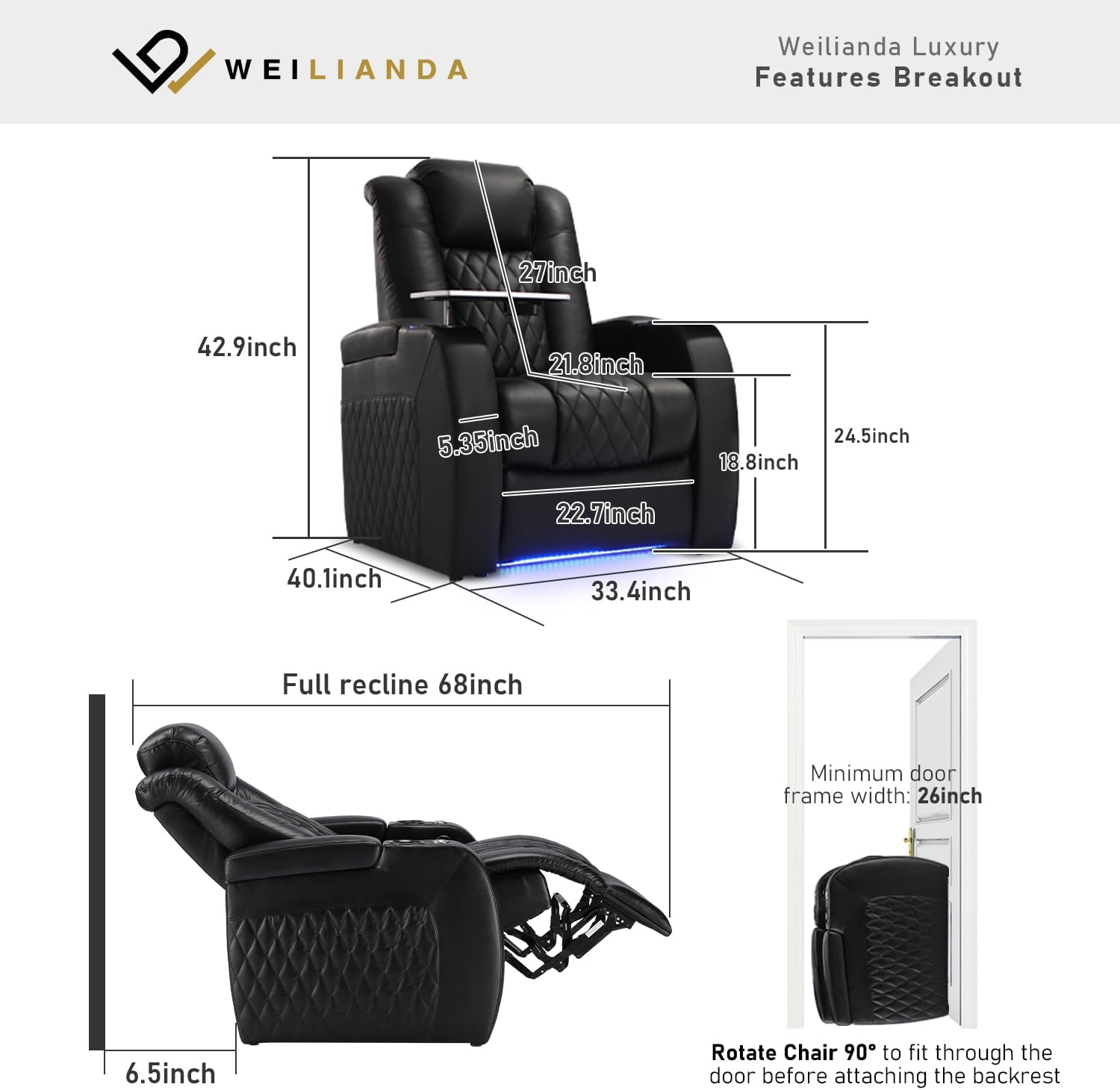 - TOP Grain Leather: Weilianda home theater seating is designed to provide the ultimate level of comfort and convenience for your movie and gaming experience. Made with top grain leather, this recliner chair is not only stylish but also incredibly durable and comfortable. The high-quality leather is soft to the touch and is easy to clean, ensuring that your seating will look great for years to come.